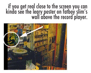 As the A&R dude and label manager for Rykodisc’s Voices imprint, I was handed the album to release. Jas Morgan, of Mondo 2000, had an original of Joe Roberts Jr “Leary for Governor” poster and had it shipped to us to use for the inside of the booklet. It was pretty cool to see, a few years later, our booklet poster hanging over Fatboy Slims’ record player on the inside of his You’ve Come A Long Way Baby album. I did try and get a scan of that album to remind you all, but I can’t find my CD. And you can even write to Norman Cook (FbS) on his site and I did. And my post was moderated right off the site. At least I could have had an answer, like sorry bub. Nope, obliterated right back into the ether of the internet. But I did snag a shot off the background of Fatboyslimdotcom; a blurry bit of a view, but until I can get a good scan there it is below.